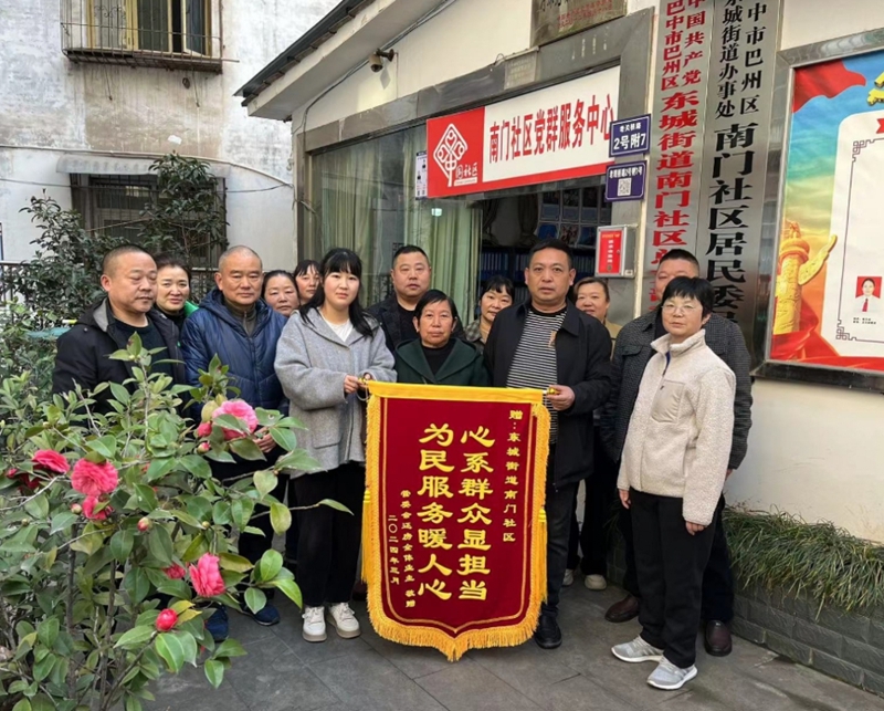 居民向巴中市巴州区东城街道南门社区送锦旗。新华网发(巴中市巴州区东城街道供图)
