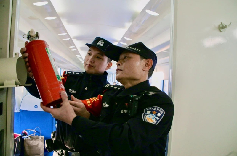 河南省洛阳市铁路公安处乘警进行安全消防检查工作。