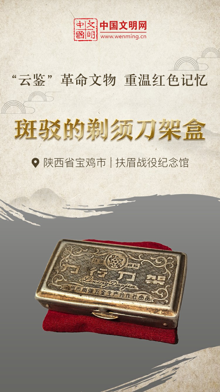 革命文物,承载党和人民英勇奋斗的光荣历史,是弘扬革命传统和革命文化、加强社会主义精神文明建设、激发爱国热情、振奋民族精神的生动教材。中国文明网“文明之声·云鉴馆藏”专栏邀您走进各地革命博物馆、纪念馆、党史馆、展览馆等展馆,一起“云鉴”红色馆藏,汲取奋进力量。今天为您介绍扶眉战役纪念馆的馆藏文物——斑驳的剃须刀架盒。